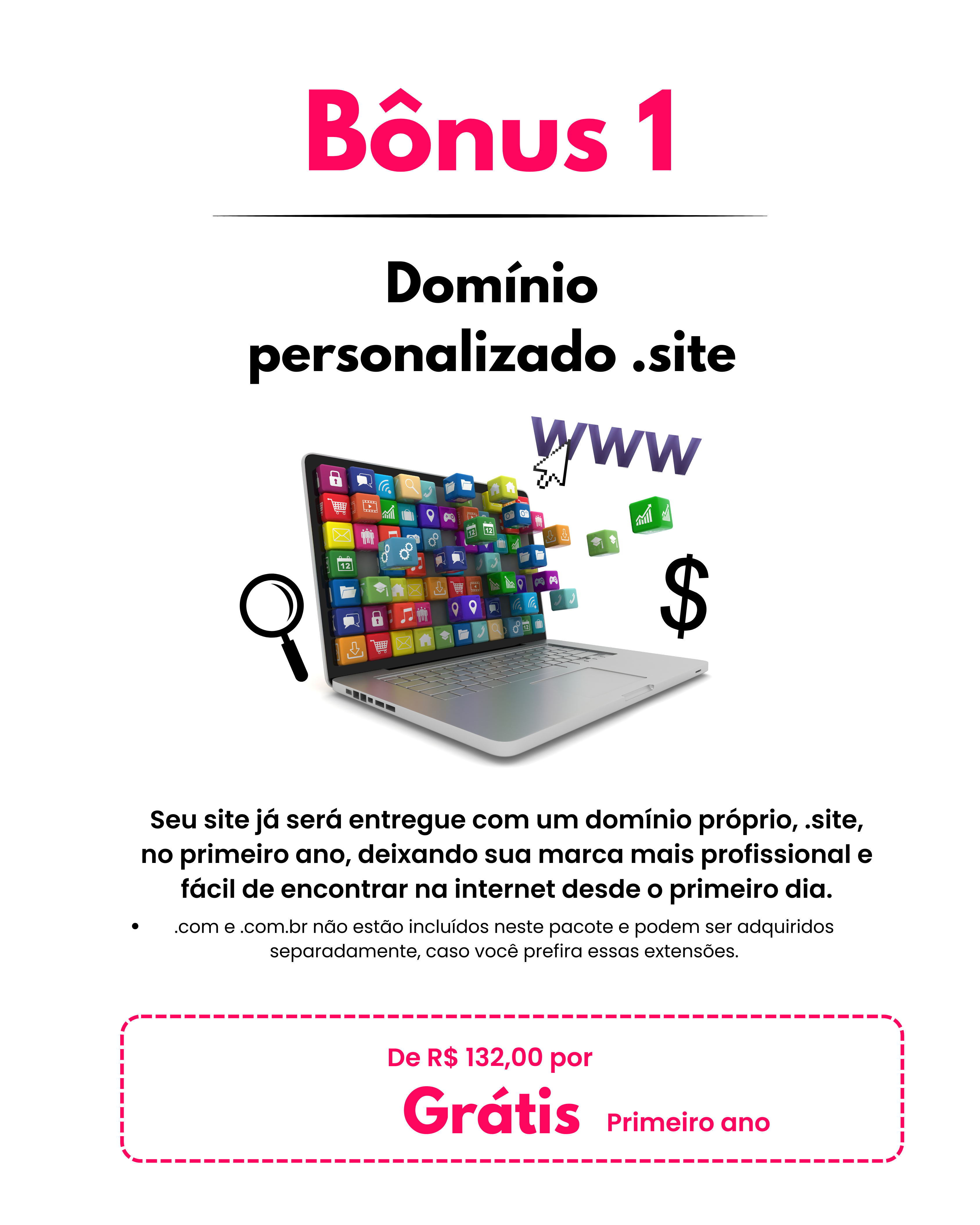 Com tudo aprovado, registramos o domínio .site com o nome que você escolher (ex.: oncurso.site) e colocamos no ar. Pronto!